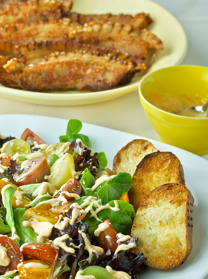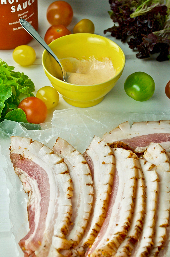 - To assemble salad, top lettuce leaves with cut tomatoes. Dress with mayo and season with salt and pepper. For each serving, place 3 slices of pork belly on top and add a couple slices of grilled baguette on the side. Enjoy!