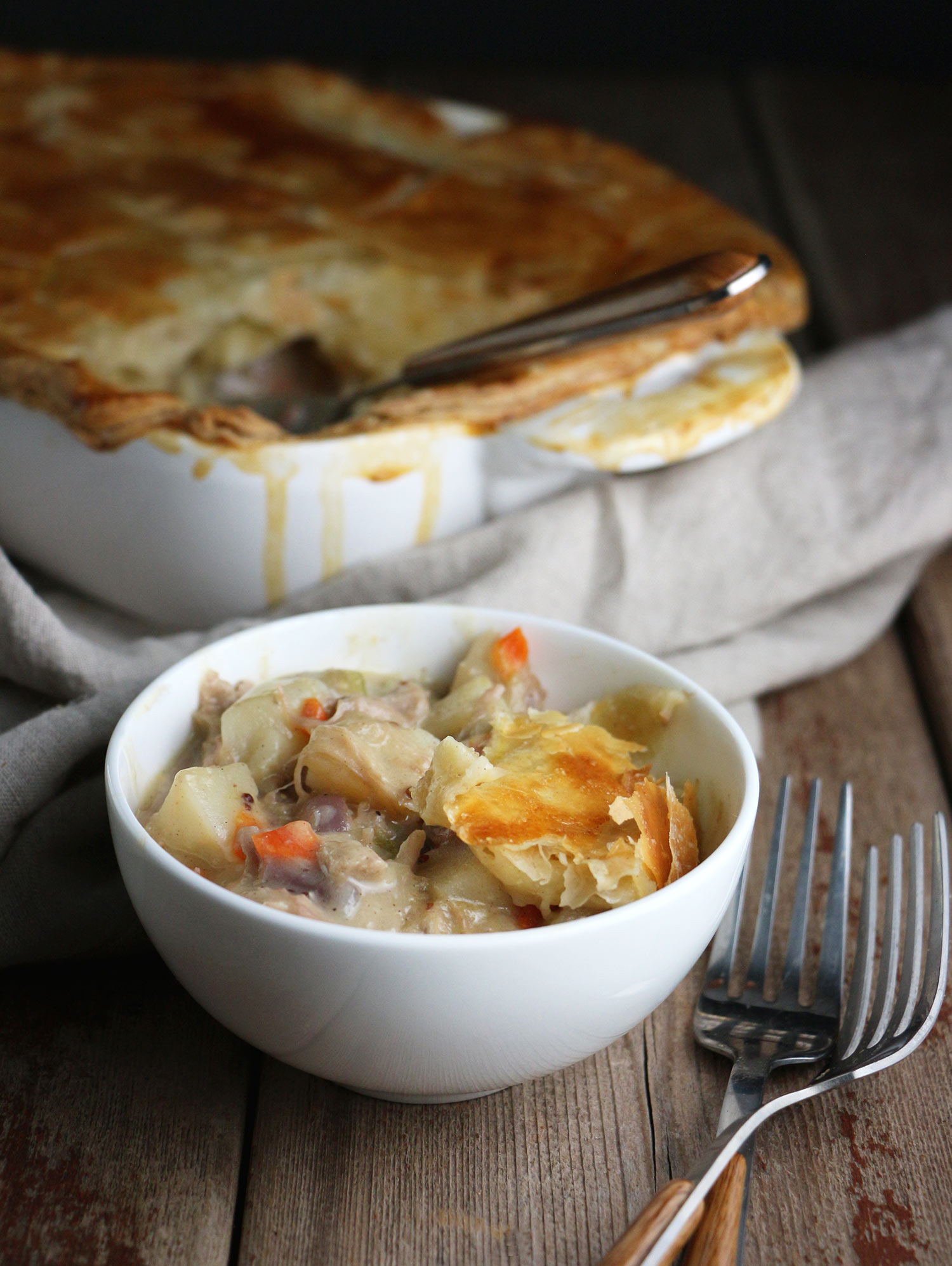 Pot pie is a recipe that takes time, but so totally worth it. Some people are happy using frozen veggie in a pot pie, which is great in a pinch, but I like to take the time to make mine from scratch. However, instead of traditional crust over the pot pie, I like to use puff pastry. Not only is it crisp, flaky, and delicious, it’s easy. I just have to defrost and I’m ready to roll!