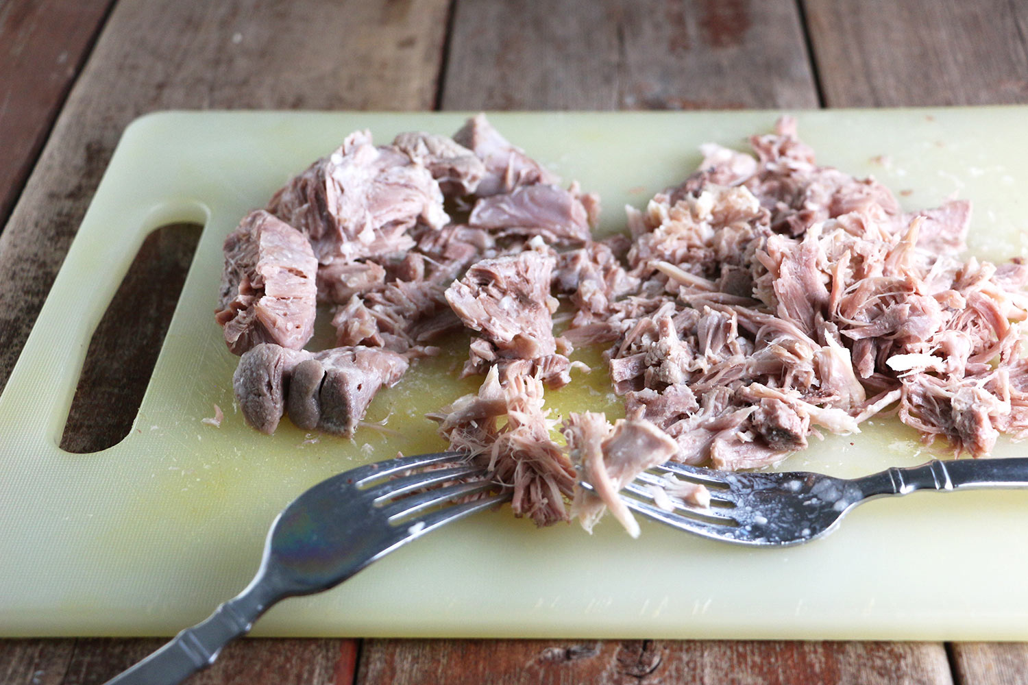 - Leave to cool in the liquid. When cool, skim off fat and drain 2 cups of cooking liquid. Remove ham hocks to a cutting board, discarding fat and bones. Shred meat with two forks. Refrigerate both meat and reserved liquid for later.