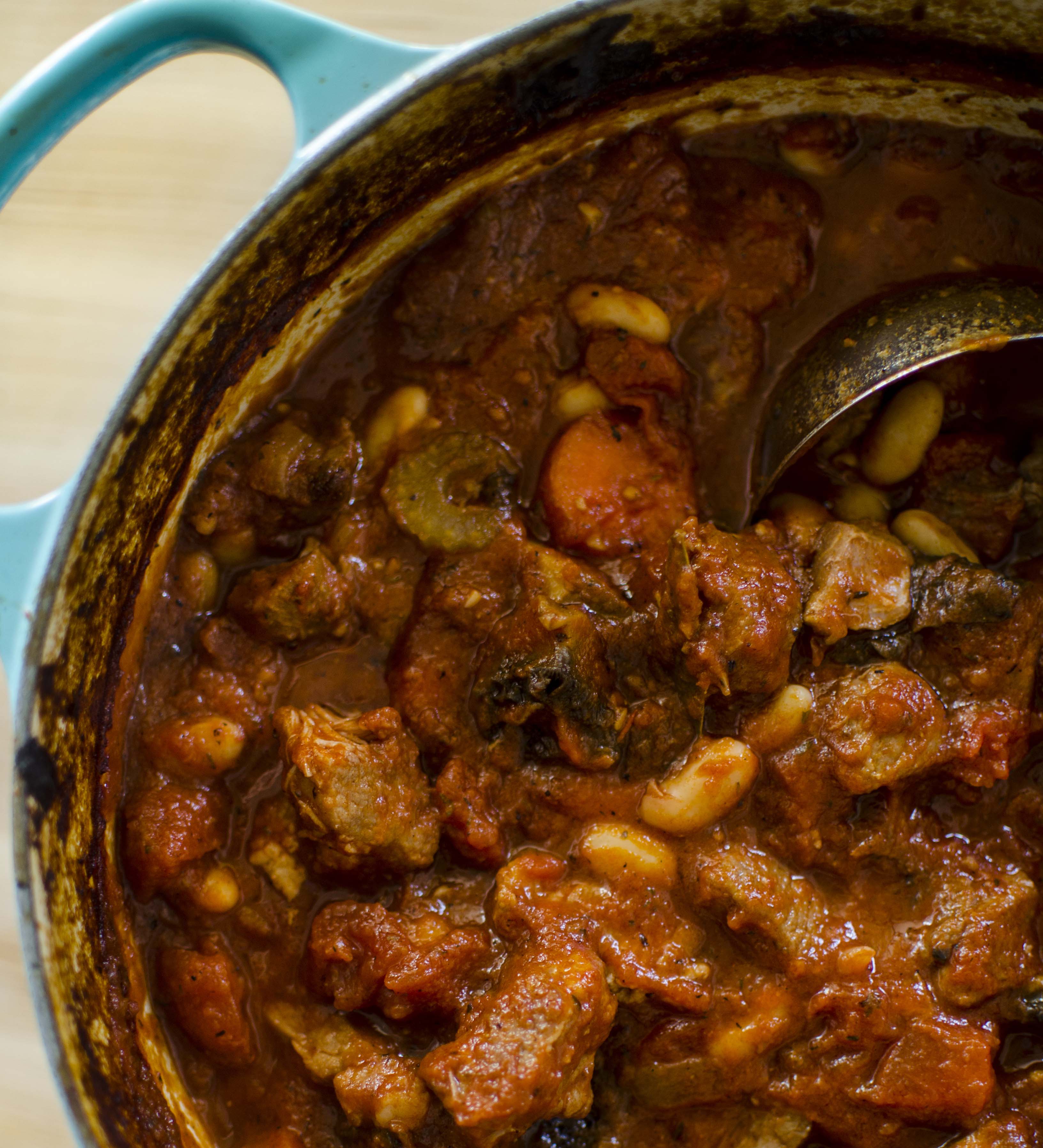 This stew is cooked in two steps. First, the meat is simmered with the vegetables for an hour in a hearty tomato and wine mixture; and second, the white beans and portabella mushrooms get added and cooked for another 45 minutes. The reason is so the white beans and mushrooms do not get overcooked and you end up with perfectly tender carrots and melt in your mouth pork.