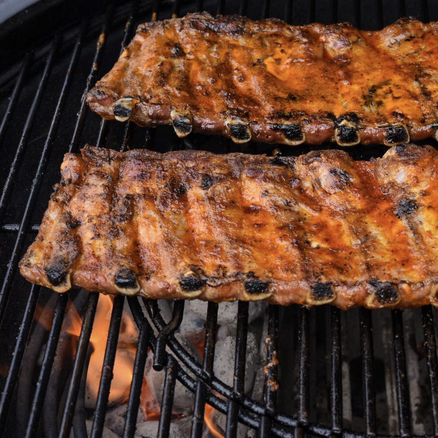 - For each rack of ribs, lay out tin foil (2 sheets thick) about 6” longer than each rack. Place ribs, meat side down on foil and wrap tightly. Return racks to the grill for 11/2 hours. Remove ribs from grill and leave in foil while increasing the temperature of the grill to approximately 450° F (maintaining a side of the grill not over direct heat).
